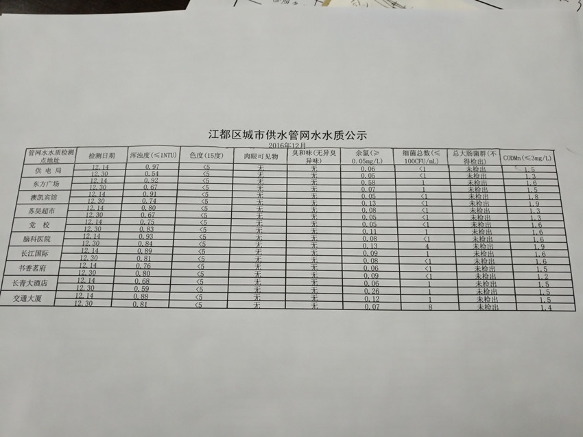 2016年12月江都區(qū)城市供水管網(wǎng)水水質(zhì)公示