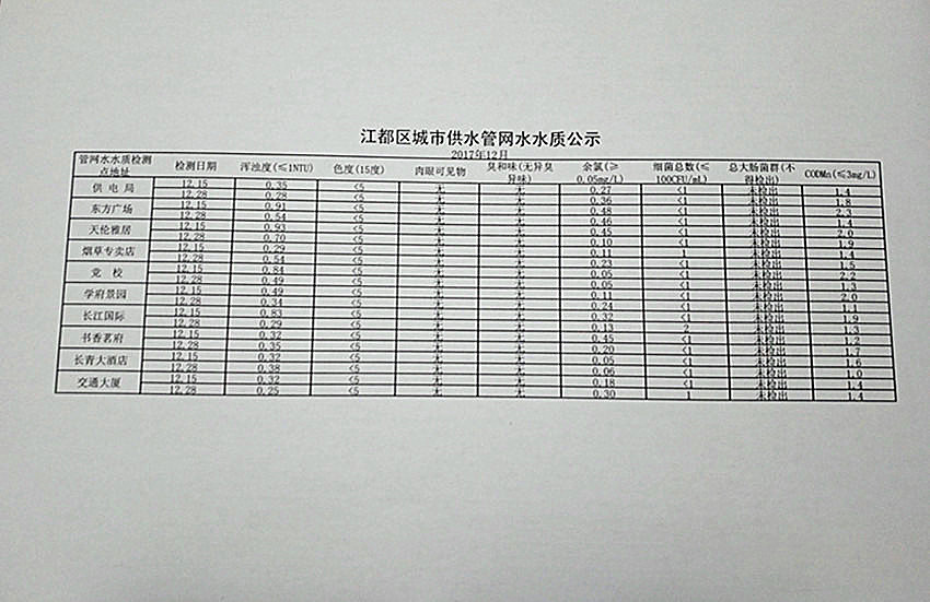 2017年12月江都區(qū)城市供水管網(wǎng)水水質(zhì)公示