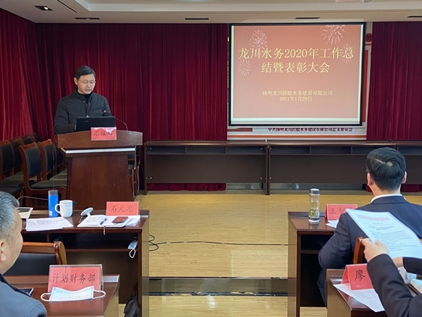2021年129日上午揚州龍川水務公司召開2020年度總結暨表彰大會,公司全體領導班子成員、受表彰的先進集體、先進個人代表、各單位負責人及部分職工代表共40余人參加了本次會議,會議由常務副總經理劉書政同志主持。