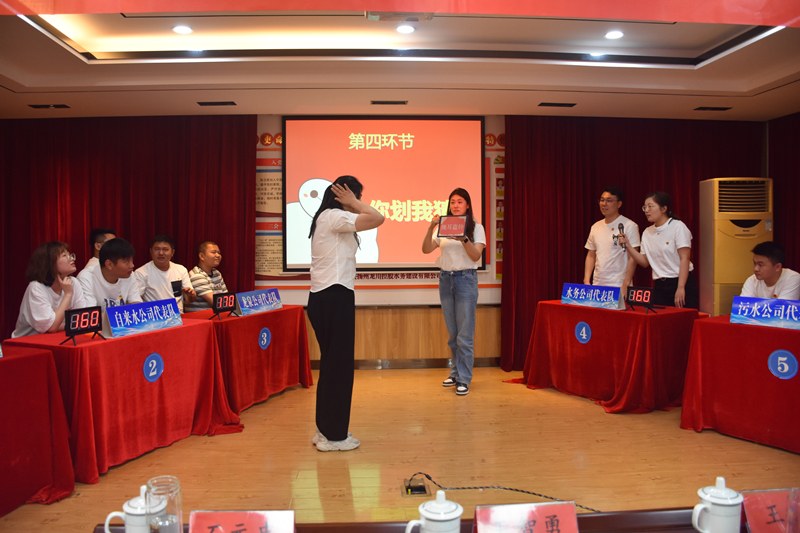 此次比賽分為小組共答題、個人必答題、搶答題、你劃我猜、風(fēng)險題五種形式,并分五輪進(jìn)行。共有五支代表隊參賽,分別是惠民、自來水、龍泉、水務(wù)、污水公司代表隊,且每個代表隊人員都是經(jīng)過層層篩選脫穎而出的。大家顯然是有備而來的,競賽過程精彩激烈,參賽選手們有的運(yùn)籌帷幄、有的胸有成竹、有的應(yīng)對自如,各代表隊你追我趕、搶答器的聲音此起彼伏,現(xiàn)場戰(zhàn)況異常激烈,展示出了新時代水務(wù)公司團(tuán)員青年的風(fēng)采。