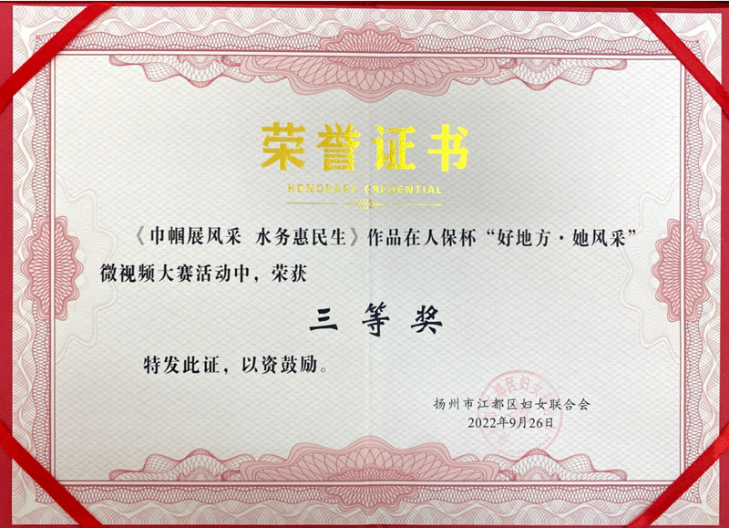 日前,水務公司創作的《巾幗展風采 水務惠民生》作品在區婦聯舉辦的人保杯“好地方·她風采”微視頻大賽活動中,榮獲三等獎。該視頻通過擷取和拍攝奮戰在供水事業各條戰線上女工有代表性的工作場景,集中展現了水務女工在各自崗位上辛勤勞作、甘于奉獻的新時代風采。