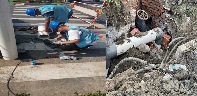 此次維修的是老水廠鋪設(shè)的DN200的PVC管道,但在施工過程中遇到了較多困難,當(dāng)挖掘機(jī)破開路面時(shí),發(fā)現(xiàn)需要破除80公分左右厚度的混凝土,但中間是DN300的鋼管,漏點(diǎn)卻在鋼管下方的PVC管與球管連接處,這無疑給施工增加了很大的難度。挖掘機(jī)施工時(shí),稍有不慎就會(huì)破壞中間鋼管,只能通過手動(dòng)一邊用風(fēng)鎬、洋鎬等進(jìn)行破碎,一邊用鐵鍬進(jìn)行開挖,同時(shí)還需要抽水作業(yè)。由于當(dāng)天室外氣溫高達(dá)34攝氏度,烈陽高照,汗水早已浸濕了現(xiàn)場施工人員的衣服,但他們不怕苦、不怕累,克服各種困難,通過3個(gè)小時(shí)不間斷地?fù)屝蓿罱K完成這段老舊管道的維修更換。
