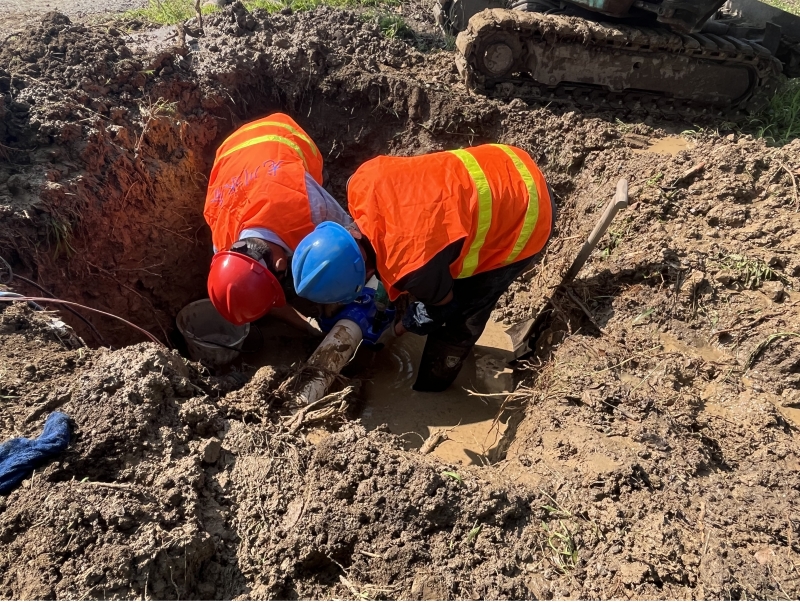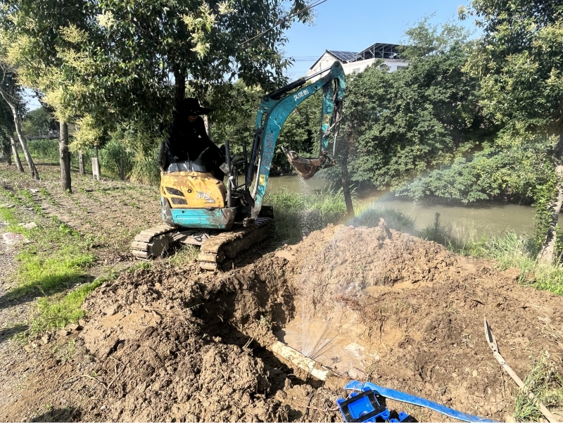 演練現場,此次搶修管道為DN110PVC管道,首先由維修人員關閉搶修點上下游閥門,在專人現場指揮下,機械挖掘組進行漏點挖掘。挖掘機設備運行良好,很快就將漏點挖出。漏點挖出后,使用水泵將坑中余水抽干。